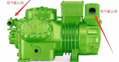 1、關閉高壓排氣及低壓吸氣截止閥,利用壓機上的工藝閥針放掉壓機內部的制冷劑,使縮機曲軸箱與大氣相通。