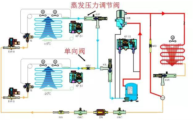 一臺(tái)壓縮機(jī)要同時(shí)向幾個(gè)不同溫度要求的庫(kù)房供冷的制冷系統(tǒng)稱為一機(jī)多庫(kù)制冷系統(tǒng)。而按制冷要求,總是希望高溫庫(kù)具有較高的蒸發(fā)壓力,低溫庫(kù)有較低的蒸發(fā)壓力。但實(shí)際上壓縮機(jī)的吸入壓力,總是隨低溫庫(kù)而定。為使高溫庫(kù)得到較高的蒸發(fā)壓力,以得到較高且恒定的蒸發(fā)溫度,在高溫庫(kù)回氣管路中設(shè)置了蒸發(fā)壓力調(diào)節(jié)閥。這就使壓力恒定在給定范圍之內(nèi),而使閥后的制冷劑氣體壓力與壓縮機(jī)吸氣壓力一致,既保證了系統(tǒng)中各個(gè)蒸發(fā)器在各自不同工況下正常工作,又有利 于壓縮機(jī)在較穩(wěn)定的吸氣壓力下運(yùn)轉(zhuǎn)。我們來(lái)看一張蒸發(fā)壓力調(diào)節(jié)閥在制冷系統(tǒng)安裝位置,如下所示:
