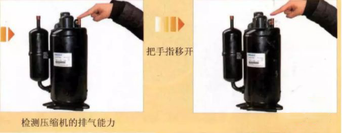 用手指按住吸氣管,若感覺(jué)到有吸氣壓力, 則表示壓縮機(jī)正常。當(dāng)把手指移開(kāi)時(shí), 如果沒(méi)有感覺(jué)到任何吸力,說(shuō)明壓縮機(jī)沒(méi)有吸氣能力。