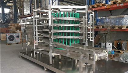 速凍隧道也稱隧道式速凍機,按使用的輸送帶形式的不同可分為網帶式和板帶式。速凍隧道對食品的速凍加工是通過網帶或者板帶輸送完成的,這樣一來凍結速速度就要比速凍冷庫的快。另外像常用的全鋁合金蒸發器沿鋼板帶運行方向排列方式的速凍隧道裝置,迎風面積增大后表面不易結霜,這樣一來可以實現長時間連續速凍加工。