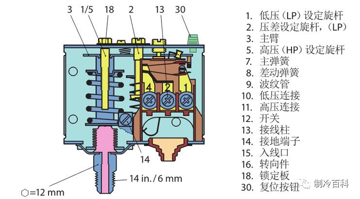 (4)壓差控制器的功能。壓差繼電器的油壓表能反映壓縮機的潤滑油(冷凍油)供給狀 態,其壓差是油泵排出油壓與吸入壓力的差,正常狀態下,其差值應該大于1.5kg/cm2 (壓力表值);當其壓值小于1.5kg/cm2時,壓差控制器在運行60s內自動停機,避免壓縮機在潤滑不良狀態下運行。